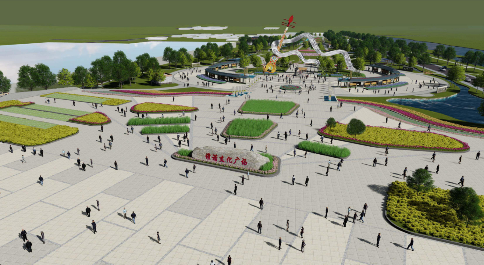 項目一方面充分利用現(xiàn)狀河流,將水系引入并貫穿整個廣場,使其靈動起來。步行觀光系統(tǒng)依托水系進(jìn)行打造,將項目內(nèi)的景觀節(jié)點進(jìn)行串連。另一方面,項目繼承和發(fā)展了理性主義莊重典雅、精致大方的原則。采用象征主義的設(shè)計手法,形式與結(jié)構(gòu)相統(tǒng)一。創(chuàng)造出“大氣、自然、獨具個性”的建筑風(fēng)格,符合保護(hù)與利用結(jié)合的初衷,確保區(qū)域休閑旅游的可持續(xù)發(fā)展,成為區(qū)域旅游及市民景觀的亮點。